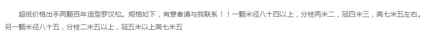 超低价格出手两颗百年造型罗汉松。规格如下,有意者请与我联系!!一颗米径八十四以上,分枝两米二,冠四米三,高七米五左右。另一颗米径八十五,分枝二米五以上,冠五米以上高七米五