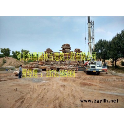 河北恒腾园林古建筑工程有限公司假山制作用“刹”为了安置底面不平的山石,在找平石之上面以后.于底下不平处垫以一至数块控制平稳和传递重力的垫片.北方假山师傅称为“刹”,江南假山师傅称为垫片或重力石。山石施工术语有“见缝打刹”之说。“刹”分重力“刹”和浮“刹”,重力“刹”是平稳设施,浮“刹”是填充设施。“刹”要选用坚实的山石,在施工前**打成不同大小的斧头形片以备随时选用。