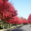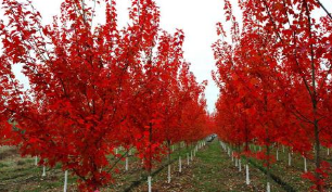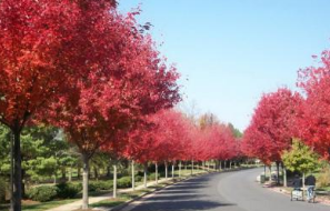 美国红枫(学名:Acer rubrum L.):原产美国东海岸,主要来自于美国北部以及加拿大大部分地区。是落叶大乔木。生长较快,成年高树12-18米,冠幅12米,能适应多种范围的土壤类型生长。春天开花,花红色。因其秋季色彩夺目,树冠整洁,被广泛应用于公园、小区、街道栽植,既可以园林造景又可以做行道树,深受人们的喜爱,是近几年引进的美化、绿化城市园林的理想珍稀树种之一。也是唯一可以用做行道树的彩叶树种。