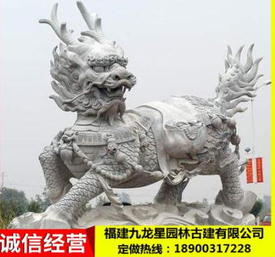 麒麟,不仅是祥瑞的象征,麒麟文化还反映出中华民族的大融合,是中华民族团结统一的象征。并且从春秋时代至今已经有二千五百多年,中国民间长久寄寓传颂的麒麟经我们雕刻,体现形态庄重,威而不猛,泰而不骄,贵而不俗,灵而不钝,蕴含着自强不息、厚德载福,向往盛世、平和可亲的精神,体现大中华风范。 曲阳石雕麒麟在国内外享有“石破天惊,巧夺天工”之盛誉,文化部副部长潘震宙为嘉祥石雕麒麟题词:“古有麒麟卧龙藏,石生汉化蕴灵光;武氏祠内镌史记,曾子故里乃儒乡;石破天惊在嘉祥,巧夺天工美名扬。”我们为开封制做的“宋都御街石雕” 曾被温总理誉为——“中华石雕之***”。有"中华石雕大王"称号,其作品被选入全国首届民间 工艺美术作品及名艺人作品展。现中国建行门前的石雕麒麟就是由曲阳鸿永园雕刻厂精心雕刻的,祁佑我们祖国国富民强!