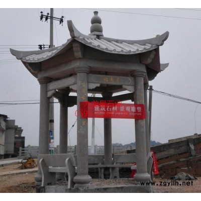石雕凉亭体量小,平面严谨。自点状伞亭起,三角、正方、长方、六角、八角以至圆形、海棠形、扇形,由简单而复杂,基本上都是规则几何形体,或再加以组合变形。根据这个道理,可构思其他形状,也可以和其他园林建筑如花架、长廊、水榭组合成一组建筑。石雕亭子的平面组成比较单纯,除柱子、坐凳(椅)、栏干,有时也有一段墙体、桌、碑、井、镜、匾等。石雕亭子的平面布置,一种是一个出入口,终点式的;还有一种是两个出入口,穿过式的。视亭大小而采 亭子用石雕亭子的立面,因款式的不同有很大的差异。但有一点是共同的**是内外空间相互渗透,立面显得开畅通透。个别有四面装门窗的,如苏州拙政园的塔影亭,这说明其功能已逐渐向实用方面转化。石雕亭子的立面,河北欧景凉亭**好的凉亭制作公司,可以分成几种类型。这是决定石雕亭子风格款式的主要因素。如:中国古典、西洋古典传统式样。这种类型都有程式可依,困难的是施工十分繁复。中国传统石雕亭子柱子有木和石两种,用真材或砼仿制;但屋盖变化多,如以砼代木,则所费工、料均不合算,效果也不甚理想。西洋传统型式,现在市面有各种规格的玻璃钢、GRC柱式、檐口,可在结构外套用。 平顶、斜坡、曲线各种新式样。要注意石雕亭子平面和组成均甚简洁,观赏功能又强,因此屋面变化无妨要多一些。如做成折板、弧形、波浪形,或者用新型建材、瓦、板材;或者强调某一部分构件和装修,来丰富石雕亭子外立面。仿自然、野趣的式样。目前用得多的是竹、松木、棕榈等植物外型或木结构,真实石材或仿石结构,用茅草作顶也特别有表现力。帐幕等新式样,以其自然柔和的曲线,应用日渐增多。