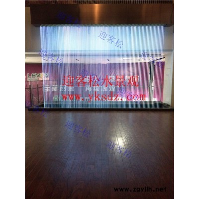 2、休闲娱乐行业门厅主立面(形象墙)光纤的应用 应用一:在豪华大气的门厅可采用水幕光纤瀑布水体沿着光纤线流动,构成了无声的闪烁水幕,而流水不会喷洒到四周,并使空气变湿润,可以在室内起到观赏、间隔空间、配合室内设计的作用流水光纤水幕一般包括一个底部蓄水池,成套的水景设备,以及配水箱(包括:带有相同数量的可调节的出水口的配水管等)光纤水帘是透明的、几乎没有弹性的线,有规定的直径和很高的抗拉强度 绿化工程迎客松水景光纤水帘水景绿化工程迎客松水景光纤水帘水景