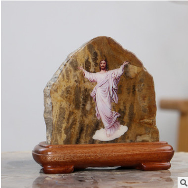 新款天然木化石耶稣画像摆件 创意家居软装家装奇石贴花工艺礼品
